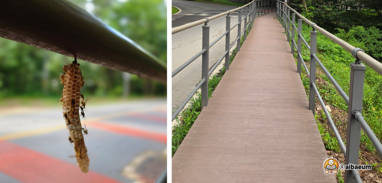 중간즈음 데크 난간에 벌집이 있어 신기했답니다.